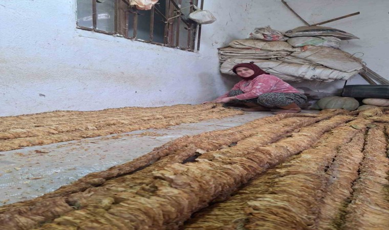 Manisa’nın Sarıgöl ilçesine bağlı Kızılçukur Mahallesinde eski yöntemlerle tütün yetiştiren üretici Leyla Zeybek 8 dekarlık tarlasına dikimini yaptığı tütünlerden 500 kilogram tütün elde etti.