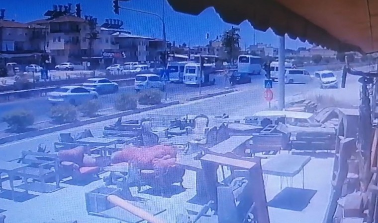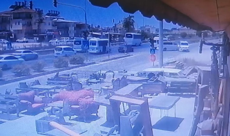 Kaza; Manavgat-Antalya D-400 Karayolu’nda meydana geldi. Alınan bilgiye göre; Kadir İpekli’nin kullandığı 35 TEK 03 plakalı Volkswagen Transporter marka tur minibüsü, Tahir Bozkurt’un kullandığı 07 TB 620 plakalı aynı marka model tur minibüsü ile çarpıştı. Araçlarda büyük maddi hasarın oluştuğu kazada kimsenin burnu kanamazken, bir minibüs çarpışmanın şiddetiyle yoldan çıkarak, yol kenarında ahşap ev yapan marangoz ustasının üzerine geldi. Durumun farkına varan marangoz ustası kaçarak kurtuldu. İş yerinin önünde çalıştığı sırada kazanın meydana geldiğini belirten marangoz ustası, “Bir anda araçlardan birisi üzerime doğru geldi. Kaçarak canımı kurtardım” diye konuştu. Kaza anları güvenlik kamerası tarafından kaydedildi.