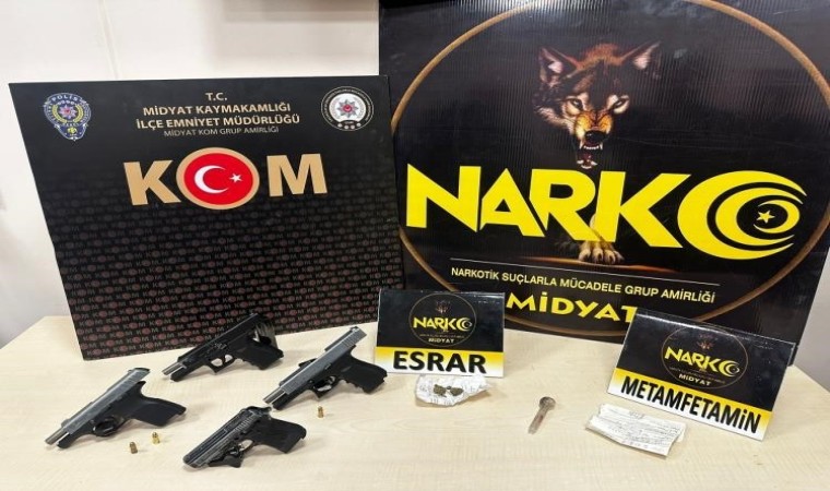 Midyat Narkotik Suçlarla Mücadele Büro Amirliğince bir adrese operasyon düzenlendi. Operasyonda, adreste yapılan aramada, 2,95 gram esrar, 3,56 gram metamfetamin, 4 ruhsatsız tabanca, 3 şarjör ve 3 dolu fişek ele geçirildi, 4 şüpheli yakalandı.