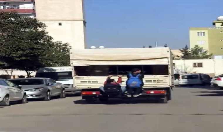 Mardin’in Kızıltepe ilçesinde iki çocuk, seyir haldeki kamyonetin arkasına asılarak yürekleri ağızlara getirdi.