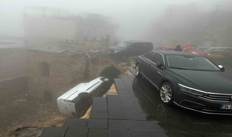 Mardin’in Artuklu ilçesinde sağanak yağıi nedeniyle çöken yoldaki 2 araçta hasar oluştu.
