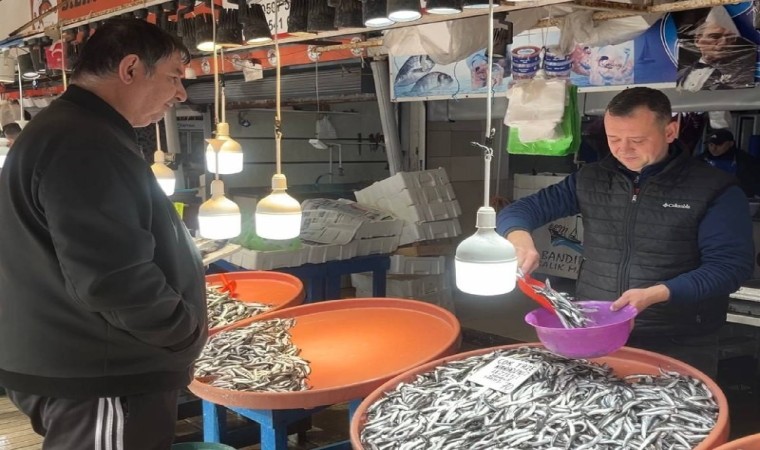 Balıkesir Büyükşehir Belediyesi Bandırma Su Ürünleri Hali’nde Karadeniz hamsisinin kilosu 50 liraya kadar düştü.