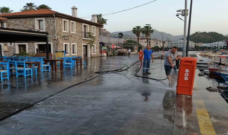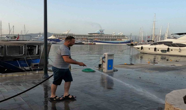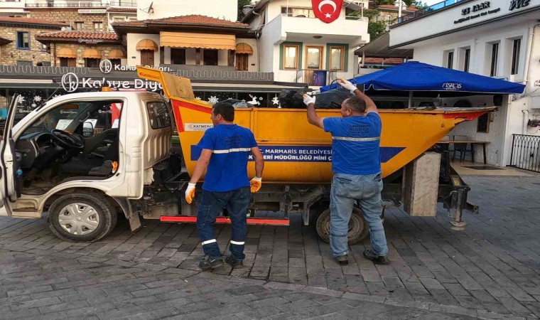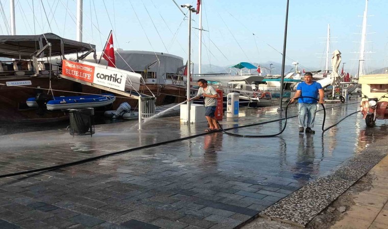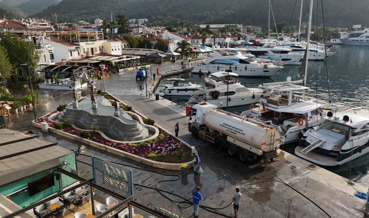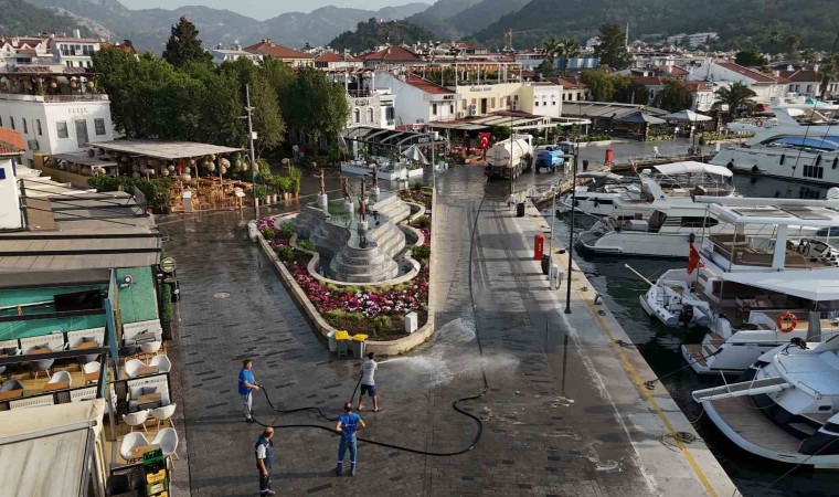 Her gün binlerce kişiyi ağırlayan Yat Limanı ve Barlar Sokağı, Marmaris Belediyesi ekiplerinin yoğun çalışmasıyla tertemiz oluyor.