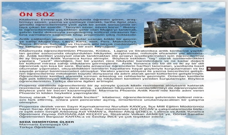 Marmaris Evren Paşa İlköğretim okulundan 15 öğrenci ve Proje yürütücüsü Türkçe öğretmeni Seda Demirtürk Ülker 7 ay boyunca Muğla’daki antik kentleri gezerek, rehberler ve arkeologlardan bilgi edinerek, antik yunanca dersi, resim ve yazarlık dersleri alarak ortaya çıkardıkları kitapta verdikleri bilgileri de resmederek anlattılar. Muğla Valiliğinin destek ve himayesinde, Marmaris Kaymakamlığı, İlçe Milli Eğitim Müdürlüğü destekleri ile yazılan ‘Muğla’nın antik incileri’ kitabı bugün Marmaris Kale Müzesinde tanıtıldı. Öğrencilerin oldukça heyecanlı ve gururlu olduğu tanıtım ve imza gününe Marmaris Kaymakamı Nurullah Kaya, Cumhuriyet Başsavcısı Fatmagül Yörük, , Marmaris İlçe Milli Eğitim Müdürü Serap Aksel, Marmaris Kalesi Müze Müdürü Şehime Atabay, Marmaris Evrenpaşa Ortaöğretim Okulu Müdürü Zeki Özcan, proje yürütücüsü öğretmen Seda Demirtürk Ülker, öğrenciler ve velileri katılarak mutluluklarına ortak oldu.
