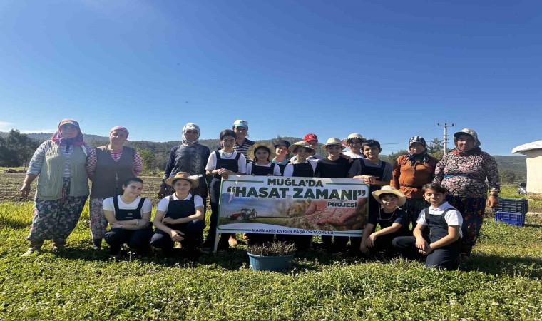 Muğla’da yetişen tarım ürünlerini tanımak amacıyla "Hasat Zamanı" adlı bir proje başlatan Marmaris Evren Paşa Ortaokulu öğrencileri, proje dahilinde Marmaris’ten yola çıkarak ürünlerin ekim, dikim ve hasadının yapıldığı tarlada hem ürünleri yakından tanıdılar hem de çiftçilerle sohbet edip tarımın önemini kavradılar.