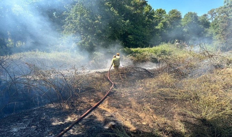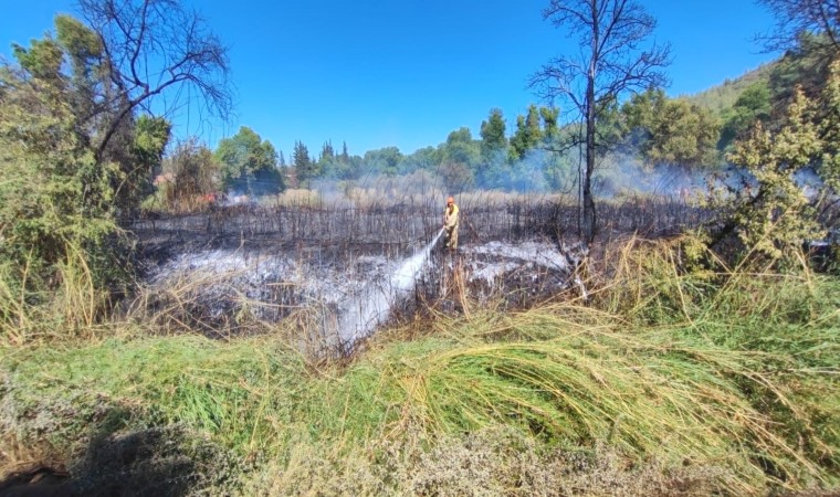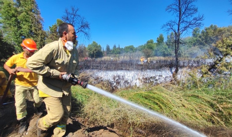 Yangının çıkış sebebinin henüz belirlenemediği sazlık ve sığla ağaçları ile çevrili alanda soğutma çalışmaları devam ediyor.