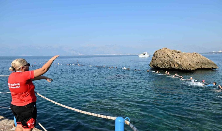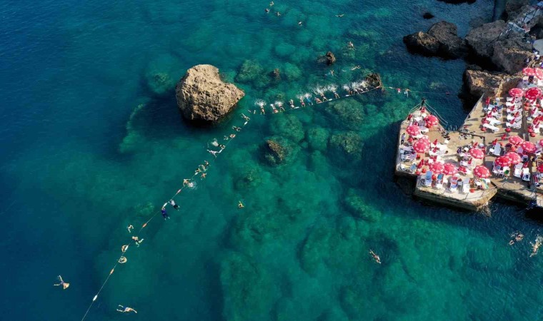 Antalya’da Muratpaşa Belediyesinin falez sahil bandında yer alan Mavi Bayraklı Erenkuş plajında haftada üç gün düzenlenen su jimnastiği kursu yoğun ilgiyle gerçekleşiyor.