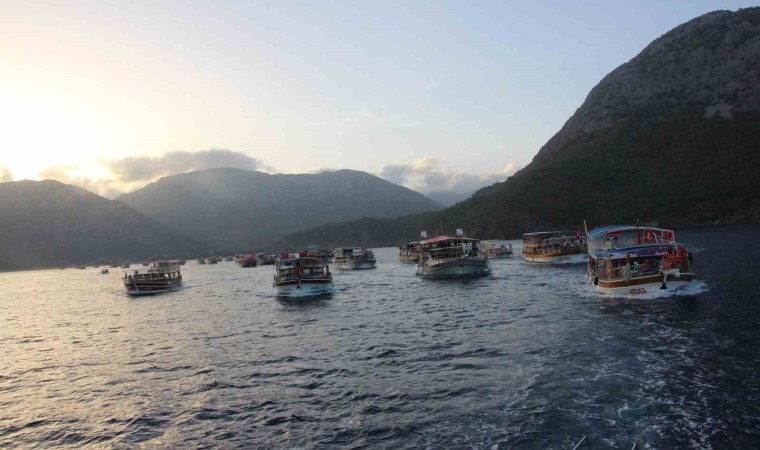 Kumluca Kaymakamlığı tarafından düzenlenen etkinlikte Adrasan koylarında yaz mevsimi boyunca turistleri taşıyan tur tekneleri, Cumhuriyetin 100. yıl dönümü