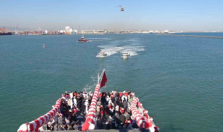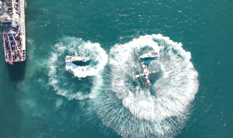 Mersin’de bulunan Türkiye’nin milli gemilerinden TCSG Yaşam, şehit aileleri ve gazileri ağırlarken, Sahil Güvenlik Komutanlığının denizden ve havadan gerçekleştirdiği ‘Su Gözü’ gösterisi heyecan verdi.