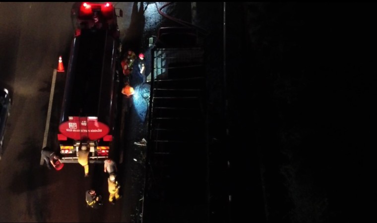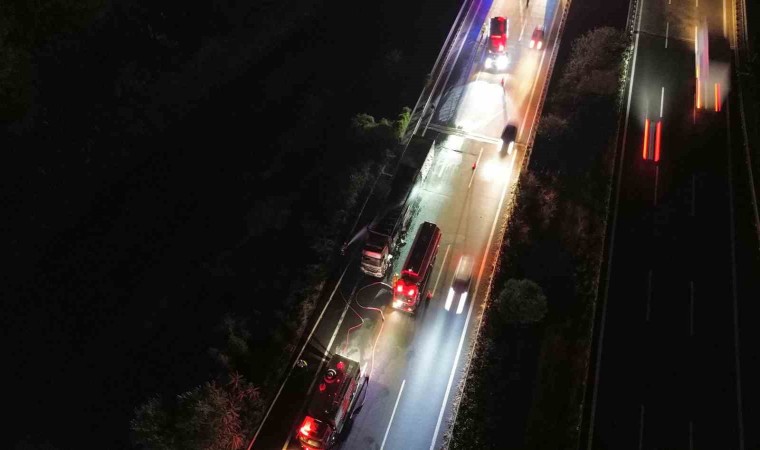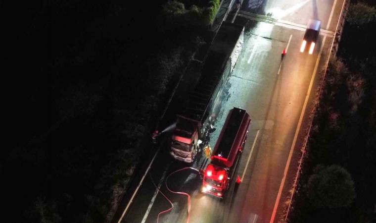 Yangın sebebi ile tek şeritten verilen yol aracın söndürülmesinin ardından 2 şeritten verilirken, tırın kaldırılma çalışmalarına ise sabah saatlerinde başlanılacak.