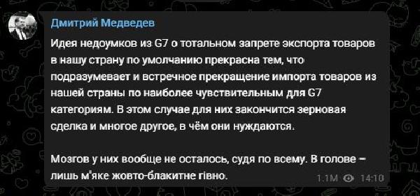 Resmi Telegram hesabı üzerinden konuya ilişkin açıklama yapan Medvedev, “G7 aptallarının ülkemize ihracatın tamamen yasaklanması fikri, G7'nin en hassas olduğu kategorilerde ülkemizden ithalatın da yasaklanması anlamına gelmektedir. Bu durumda tahıl anlaşması ve ihtiyaç duydukları diğer pek çok şey onlar için sona erecektir. Görünüşe göre hiç beyinleri kalmamış” dedi.