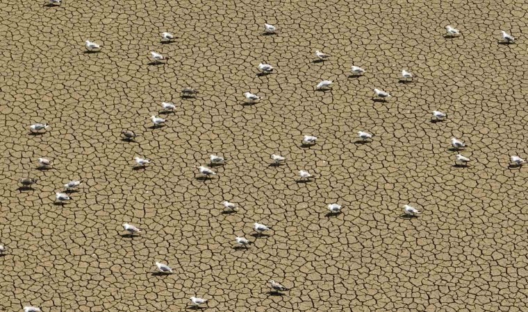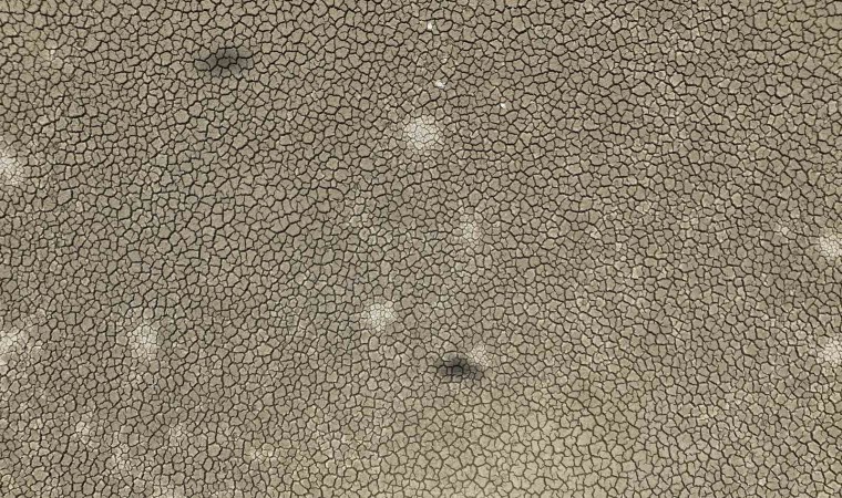 Dron ile havadan çekilen görüntülerde barajdaki su seviyesinin azaldığı ve toprak kısımlarda çatlakların oluştuğu görülüyor.