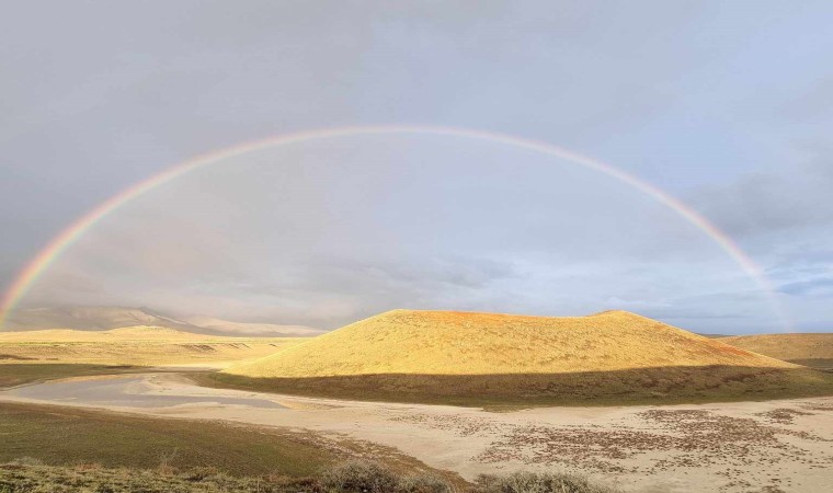 Konya’nın Karapınar ilçesinde bulunan Meke Gölü’nde yağan yağmur sonrası gökkuşağı oluştu.