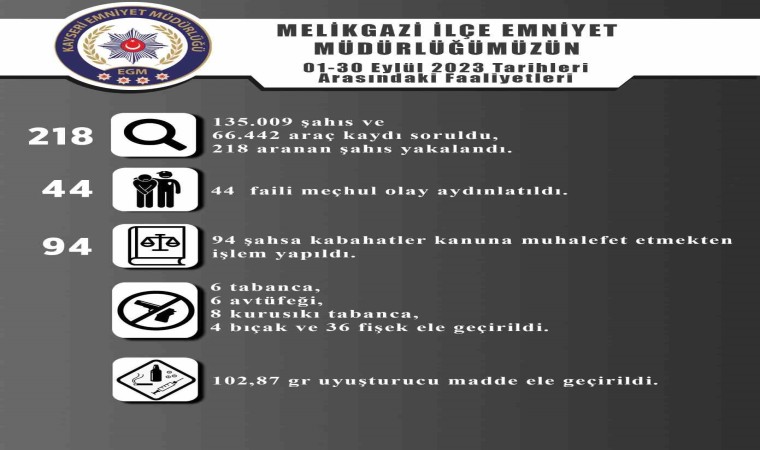 Edinilen bilgiye göre; Melikgazi İlçe Emniyet Müdürlüğünce 1-30 Eylül tarihleri arasında yapılan çalışmalarda; 135 bin 9 şahıs ve 66 bin 442 araç kaydı soruldu. Çalışmalarda; 218 aranan şahıs yakalanırken 44 faili meçhul olay da aydınlatıldı. Ayrıca 94 şahsa da kabahatler kanuna muhalefet etmekten işlem yapıldı.