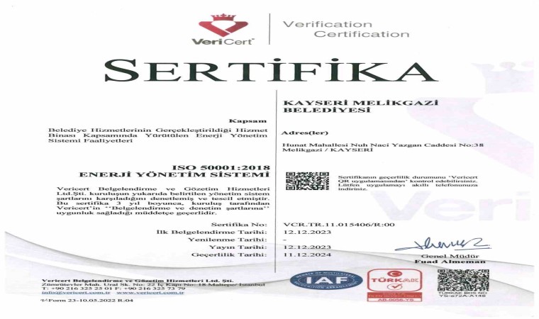 Melikgazi Belediyesi, bağımsız belgelendirme kuruluşu Vericert tarafından yapılan denetimden başarı ile geçerek TS EN ISO 50001:2018 Enerji Yönetim Sistemi Sertifikası’nı alan ilk belediye oldu.