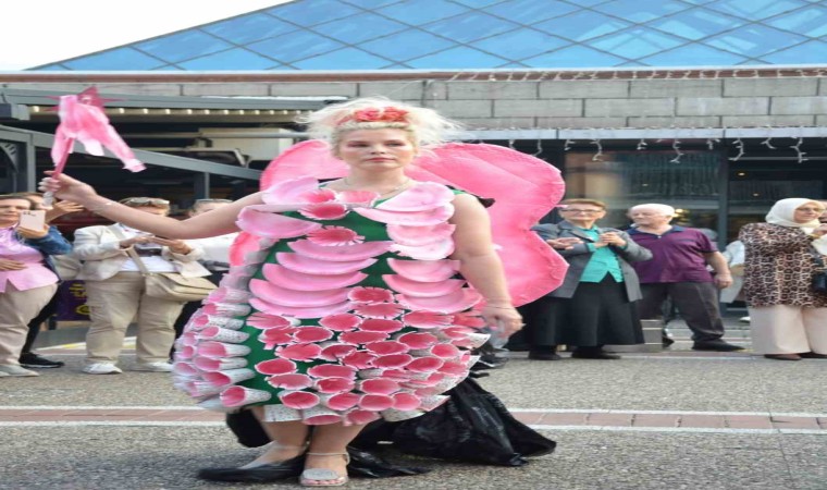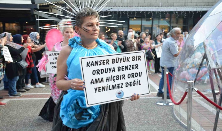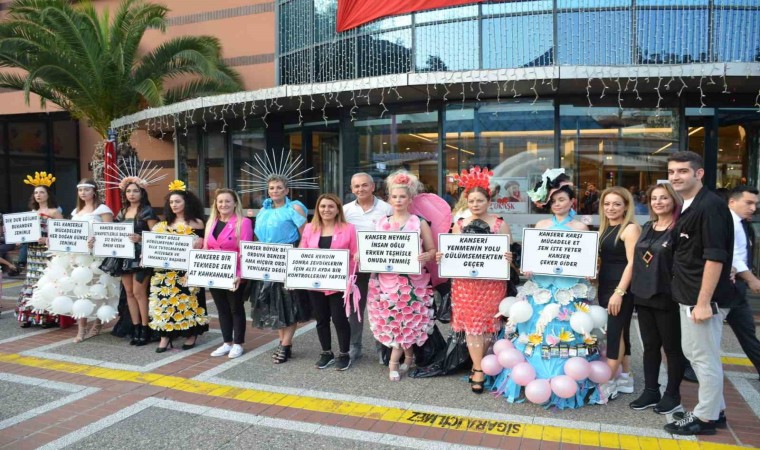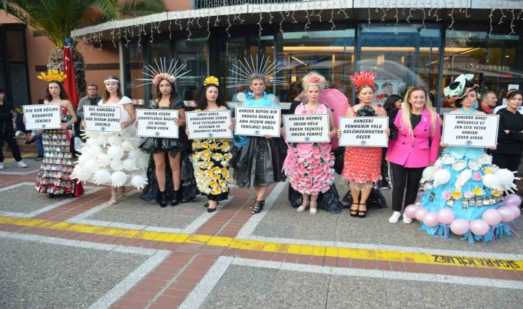 Bursa’da meme kanserine dikkat çekmek için düzenlenen defilede, kanserojen etkisi bulunan atık maddelerden yapılan giysiler tanıtıldı.