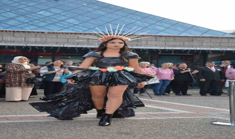Sigara paketleri, lateks eldiven, çöp poşeti, plastik ve kağıt çatal kaşık ile tabaklardan tasarlanan elbiseler defilede en büyük ilgiyi gören kostümler oldu.