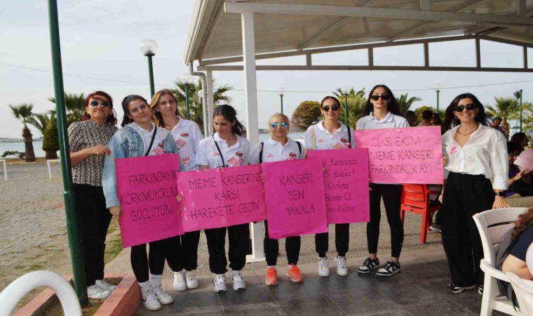 Ayvalık İlçe Sağlık Müdürlüğü tarafından organize edilen Kırlangıç AVM ile Ayvalık Belediyesi’ne ait Sarı Zeybek Sosyal Tesisleri arasındaki 300 metrelik alanda gerçekleşen yürüyüşte; meme kanserine yönelik toplumsal bilgilendirmeye yönelik pankart ve dövizler de açıldı.