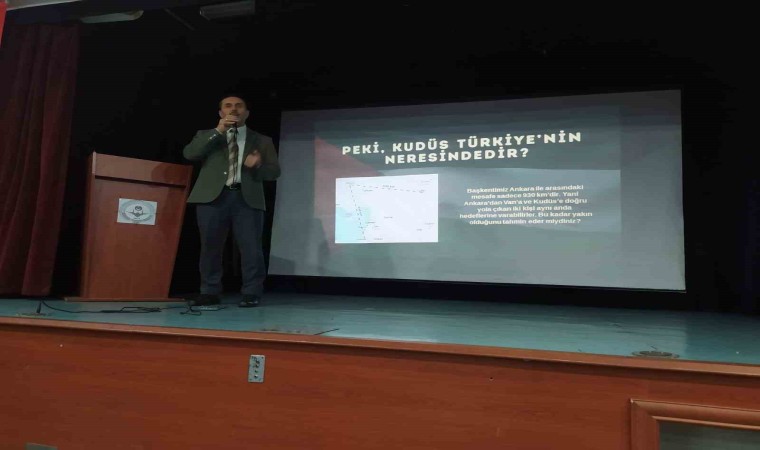 Konferans Muğla Şehit Mehmet Çetin İmam Hatip Lisesi okuluna bağlı konferans salonunda gerçekleştirildi. Konferansta konuşmaya yapan Menteşe İlçe Müftüsü Dr. Ertuğrul Akın “Bizleri dikkatlice dinleyen sevgili öğrencilerimiz ilk kıblemizin bulunduğu Kudüs’ ü ve bizim için ne kadar önemli olduğunu hep birlikte fırsatı anlama bulduk. Kudüs’ün bizim için önemi çoktur Kudüs, onlarca peygambere ev sahipliği yapmış bir şehir olmasıyla da İslamiyet’te her zaman ayrı bir yere sahiptir. Hz. Adem (as)’dan başlayarak sonraki bütün peygamberlerin ortak dini tevhittir. Nitekim Cenab-ı Hak bütün peygamberlere aynı gerçeği tebliğ ettiğini buyurmuşlardır ”dedi.
