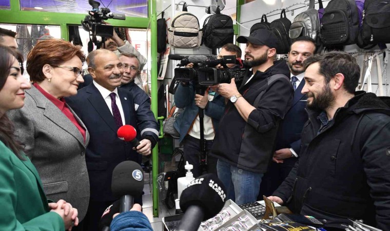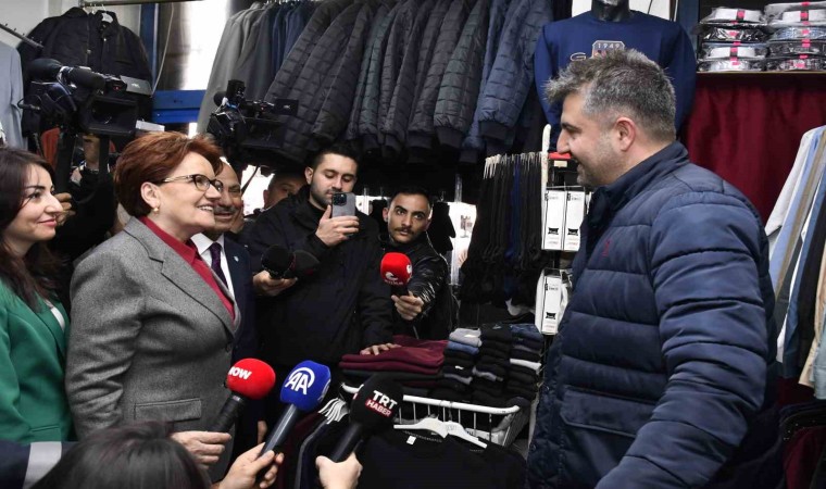 Bir telefoncuya giren Akşener, "Seçimler geldi. Bütün siyasi partiler gibi biz de geldik oy istemeye, düştük ocağına, oyunu istiyoruz" diye konuştu.
