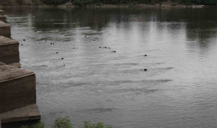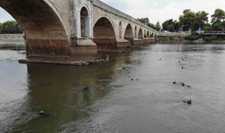 Bir zamanlar Meriç Nehri’nin iki yakasını birleştiren tarihi ahşap köprünün ayak temellerinin görünmesi Edirneli vatandaşları ve şehre gelen turistleri hayrete düşürdü.