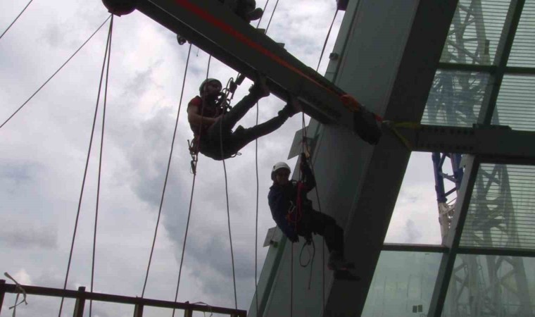 İple erişim teknikeri Musa Karahan, “Asıl mesleğim beden eğitimi ve spor öğretmenliği, 2007 yılından beri bu sektördeydim. Yaklaşık 16 yıldır bu mesleği özellikle iple erişim ve yüksekte çalışmayla ilgili eğitmenlik gibi çalışma sektöründe bulunuyordum. Yaklaşık 8 aydır bu pozisyona ve buraya geldim. Buradaki tüm çalışan arkadaşlarımızın iplerini, sistemlerini kuran ve kontrol eden personel olarak burada çalışıyorum. Bizi görenler buraya çıkmam mümkün değil diyor” dedi.