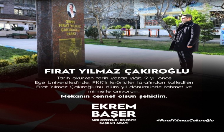 Geceli gündüzlü süren seçim çalışmaları ile seçmenin gönlüne dokunmaya devam eden Merkezefendi Belediye Başkan Adayı Ekrem Başer, 9 yıl önce PKK’lı teröristlerce katledilen üniversite öğrencisi Fırat Yılmaz Çakıroğlu’nu da unutmadı. Sosyal medya hesabından, Çakıroğlu’nun anısına yapılmış parktaki anıtı başındaki ziyareti sırasında çekilmiş bir fotoğraf paylaşan Başer, “Tarih okurken tarih yazan yiğit, 9 yıl önce Ege Üniversitesi’nde PKK’lı teröristler tarafından katledilen Fatih Yılmaz Çakıroğlu’nu ölüm yıldönümünde rahmet ve minnetle anıyorum. Mekanın cennet olsun şehidim” ifadelerini kullandı.
