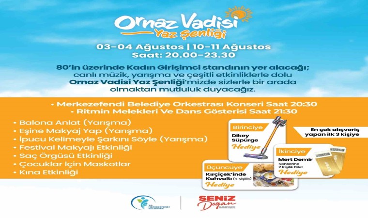 Merkezefendi Belediyesi tarafından vatandaşların eğlenceli ve keyifli vakit geçirmesi amacıyla ‘Ornaz Vadisi Yaz Şenliği’ gerçekleştirilecek. Merkezefendi Belediyesi’nce düzenlenen şenlikte, girişimci kadınları desteklemek amacıyla kadınların el emeği ürünlerini sergileneceği 80 stant kurulacak ve konserler, yarışmalar ve çeşitli aktiviteler yer gerçekleştirilecek. Ornaz Vadisi Yaz Şenliği, 3-4-10-11 Ağustos tarihlerinde gerçekleştirilecek. Etkinlikler saat 20.00’den 23.30’a kadar devam edecek.