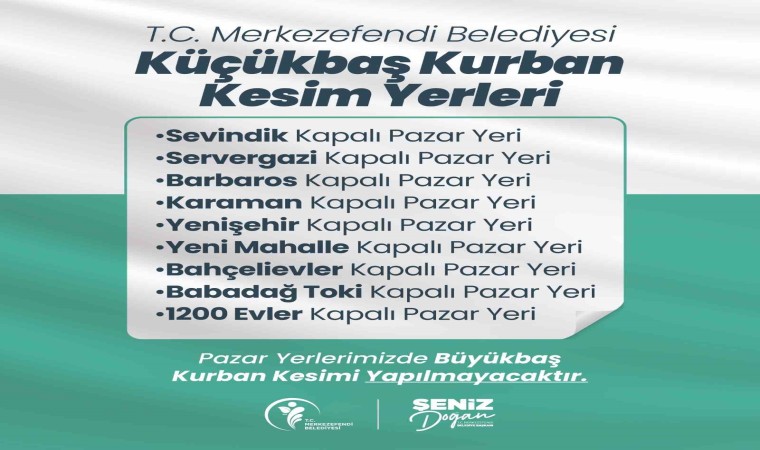 Merkezefendi Belediyesi, Kurban Bayramı’nda ilçe genelinde hizmet vereceği kurban kesim yerlerini açıkladı.