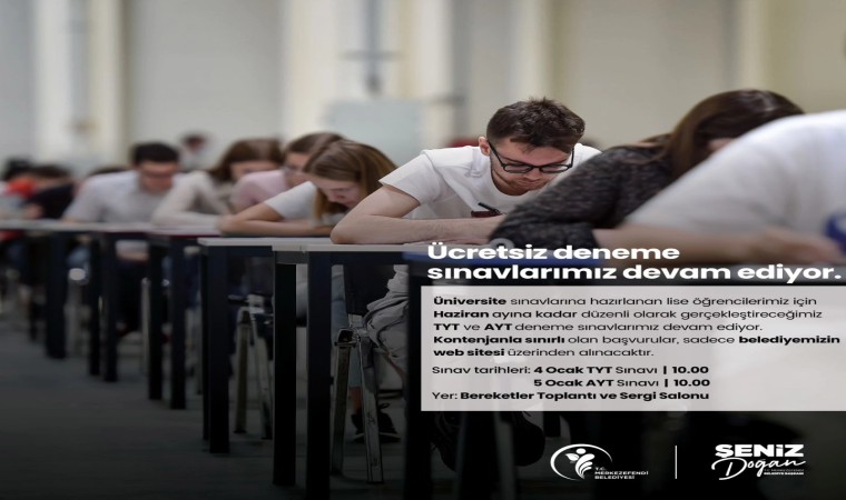 Merkezefendi Belediyesi eğitime olan desteklerini sürdürüyor. Merkezefendi Belediyesi’nce, üniversiteye hazırlanan öğrencilere yönelik ücretsiz TYT ve AYT deneme sınavları düzenleniyor. Haziran ayına kadar her ay düzenli bir şekilde yapılacak sınavların ikincisi 4 Ocak Cumartesi günü ve 5 Ocak Pazar günü gerçekleştirilecek. Her iki sınav da saat 10.00’da, Bereketler Toplantı ve Sergi Salonunda olacak.