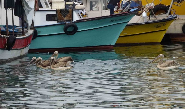 Mersin’in Erdemli ilçesinde göç yolunda mola veren 5 pelikan, balıkçı barınağında bir süre avlanarak karınlarını doyurdu. Vatandaşlar ise o anları izledi.