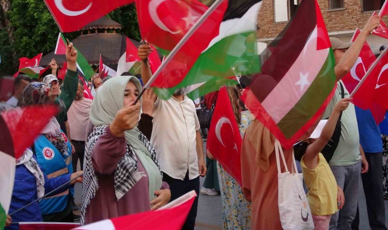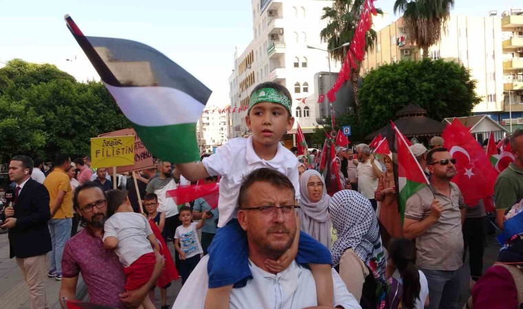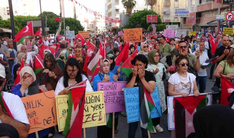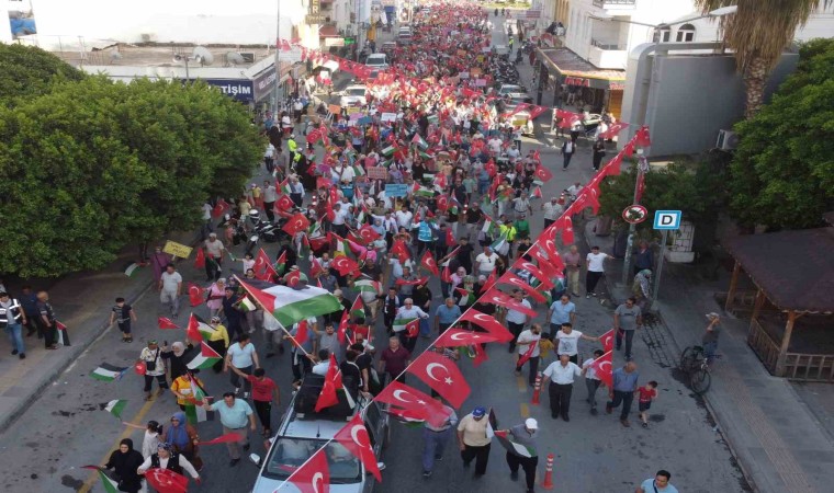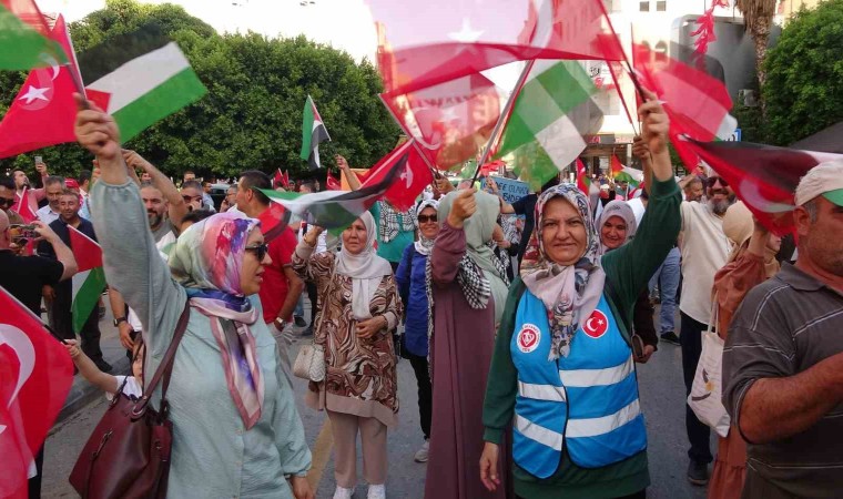 Mersin’in Erdemli ilçesinde toplanan vatandaşlar, Filistin’e destek, İsrail’e tepki yürüyüşü gerçekleştirdi.