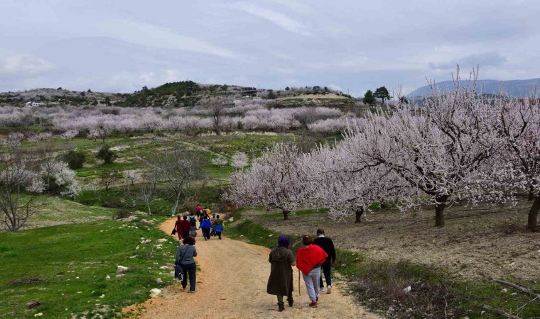 Havaların güneşli ve ılık geçmesi sebebiyle sıcaklığın 20 derecenin üzerine çıktığı ilçede kayısı ağaçları çiçek açarak görsel bir şölen sundu. Ağaçlarda çiçeklerin bol olmasına sevinen bahçe sahibi Ayşe Şeker, “Havalar bu şekilde devam ederse meyve bol olur, ağaçlar kendini kurtarır” dedi.