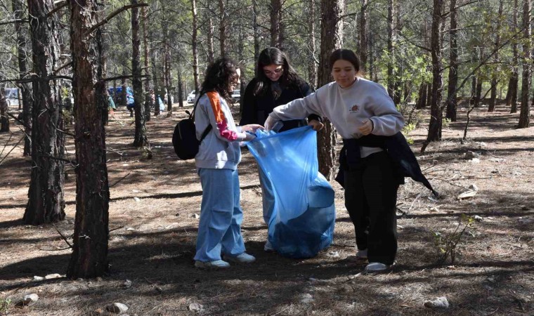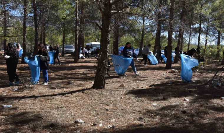 Orman yangınlarını önlemek, geri dönüştürülemeyen atıkları doğadan temizlemek ve farkındalık oluşturmak için yapılan etkinlikte öğrenciler, Mut’un Alahan mevkiisi Cumhuriyet Ormanında çöp ve atık topladı.