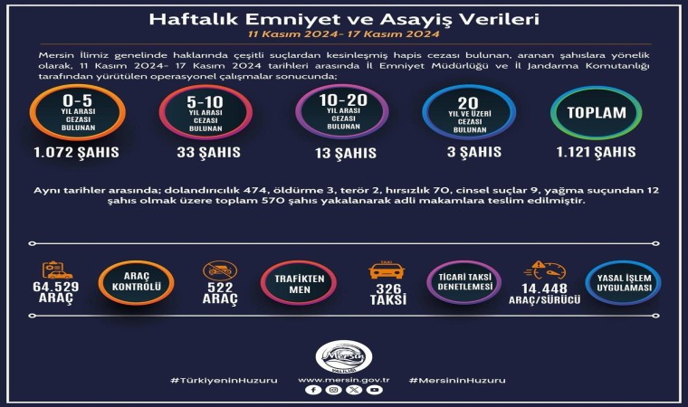 Vali Pehlivan, toplantıyla ilgili yaptığı açıklamada, 11-17 Kasım arasında emniyet ve jandarma ekiplerince yürütülen operasyonel çalışmalarda, haklarında çeşitli suçlardan yakalama kararı bulunan bin 121 kişinin yakalandığını belirtti. Pehlivan, aynı tarihler arasında dolandırıcılık, cinayet, hırsızlık, yağma gibi çeşitli suçlardan 570 şüphelinin de gözaltına alınarak adli makamlara teslim edildiğin kaydetti. Yine aynı tarihler arasında yapılan trafik denetimlerinde ise 64 bin 529 aracın kontrol edildiğini ifade eden Pehlivan, 522 aracın trafikten men edildiğini, 14 bin 448 araç ve sürücüsüne de işlem yapıldığını vurguladı.