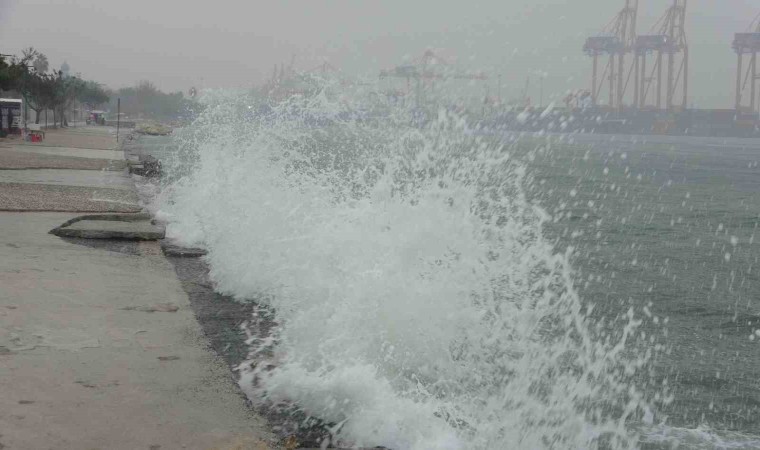 Meteorolojinin uyardığı yağışlı hava Mersin’de etkili olurken Akdeniz’de hortum çıktı, kıyıya dalgalar da vurmaya başladı.
