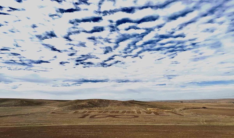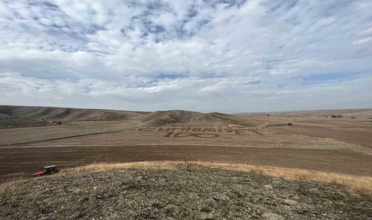 Arazisinde traktörün pulluğuyla iz bırakıp manevralar yapan genç çiftçi, toprağa "Cumhuriyet" yazıp 100 sayısı ve sonsuzluk anlamı taşıyan işareti peşine ekledi. Sonra da eserini karşı tepeden fotoğrafladı.