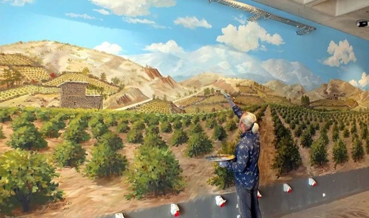 Denizli’nin Çal ilçesinde 23 yıldan bu yana duvar ressamlığı yapan Gürcan Ekici, tuval olarak kullandığı duvara resmettiği meşhur üzüm bağlarını sanat eserine dönüştürdü.