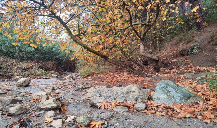 Manisa’nın Uncubozköy Mahallesinde bulunan Mesir Tabiat Parkında, ağaçlardan dökülen yaprakların akan dereye dökülmesi sonucu kartpostallık sonbahar manzarası oluştu.