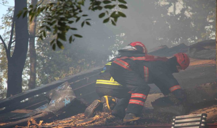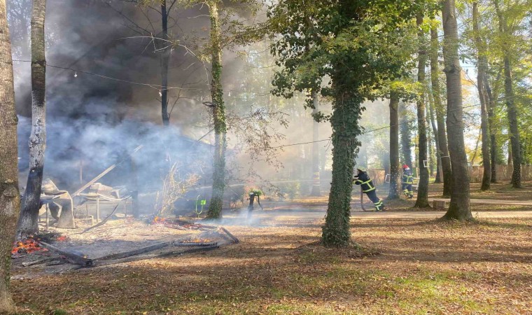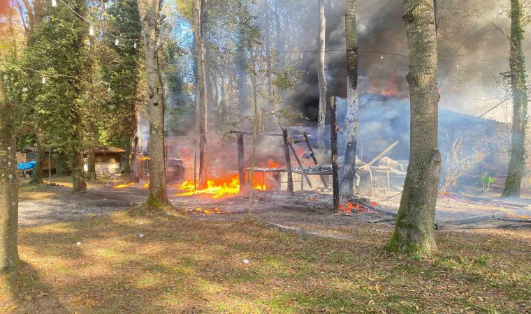 Sakarya’nın Akyazı ilçesi D-100 kara yolu üzerinde bulunan mesire alanındaki ahşap tesisinin mutfak bölümü alev alev yandı.