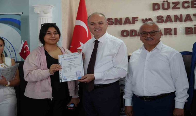 Başkan Özlü açıklamasında, “Yapı Sanatları Esnaf Odası Başkanı Bülent Keser’in daveti üzerine Mesleki Yeterlilik Belgesi almaya hak kazanan hemşehrilerimizin sertifikalarını verdik. Düzce’mizi inşa ve ihya ederken en büyük destekçilerimizden olan esnaf kardeşlerimize hayırlı işler, bereketli kazançlar diliyorum” şeklinde konuştu.