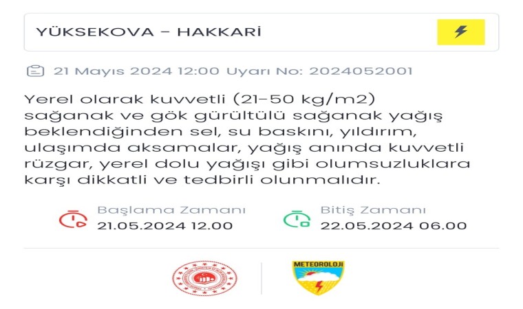 Yağışların etkili olduğu Hakkari ve ilçeleri için Meteoroloji Genel Müdürlüğü tarafından bir uyarı daha yapıldı. Hakkari, Muş, Şırnak, Bitlis ve çevresinde hava şartlarında ani değişiklikler yaşanabileceği konusunda uyarıda bulunan meteoroloji, felaketlere yol açabilecek ani hava durumlarına karşı vatandaşların dikkatli olmasını istedi.