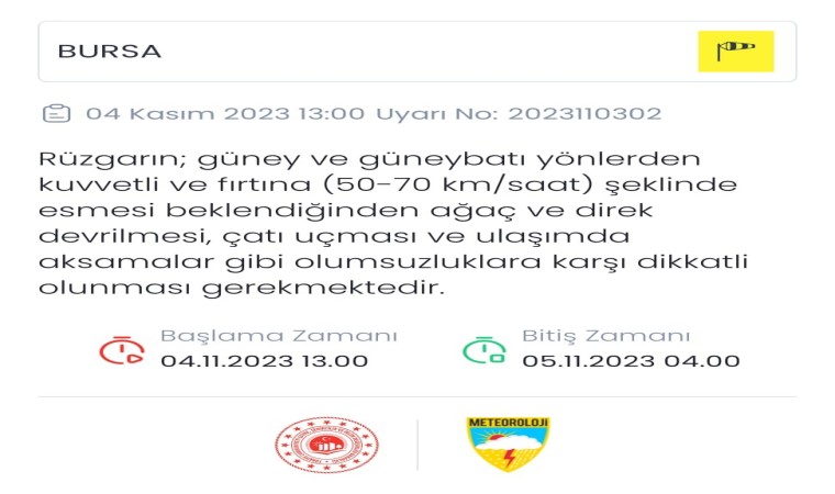 “Rüzgarın; güney ve güneybatı yönlerden kuvvetli ve fırtına (50-70 km/saat) şeklinde esmesi beklendiğinden ağaç ve direk devrilmesi, çatı uçması ve ulaşımda aksamalar gibi olumsuzluklara karşı dikkatli olunması gerekmektedir.”