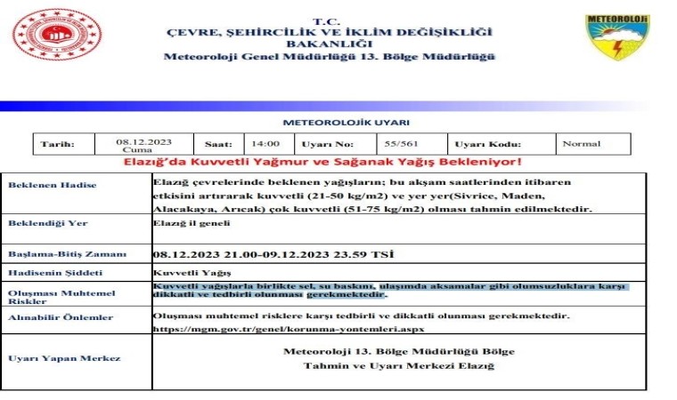 Meteoroloji 13. Bölge Müdürlüğü Bölge Tahmin ve Uyarı Merkezi, Elazığ için kuvvetli yağış uyarısında bulundu.