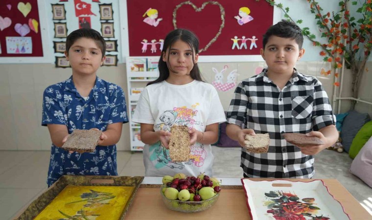 Niğde’de ilkokul 4. sınıf öğrencileri sınıf öğretmenlerinin danışmanlığında geliştirdikleri proje ile meyve çekirdeklerinden mobilya yapımında kullanılan sunta ve kaplama malzeme üretti.