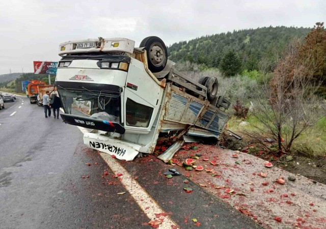 Meyve yüklü kamyon devrildi, yol karpuz tarlasına döndü