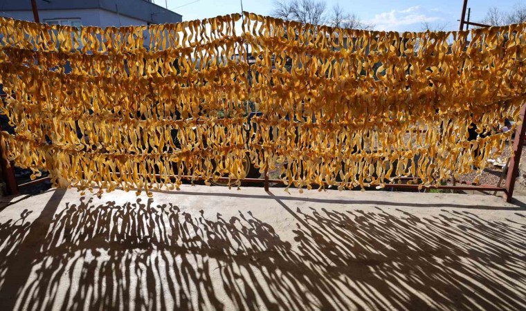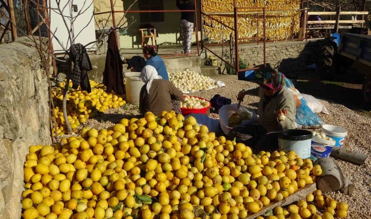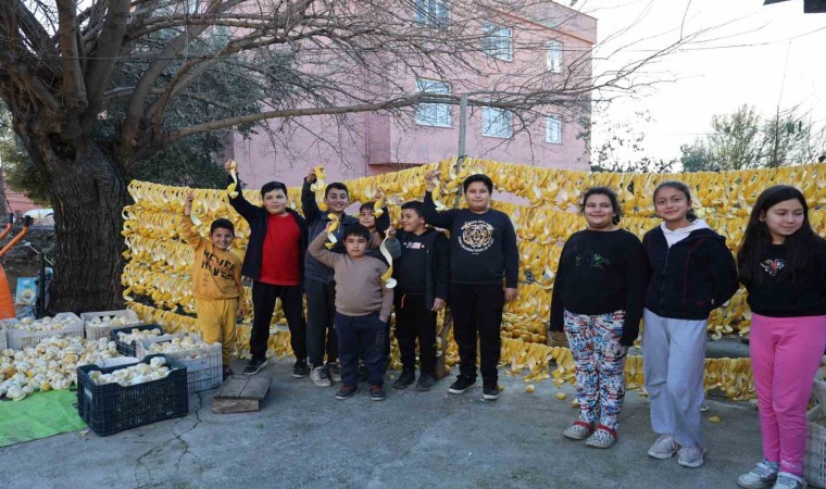 Limon, portakal ve turunçları römorklar ile evlerinin bahçesine taşıyan Turunçlu Mahallesi sakinleri evleri önünde aileleri ile birlikte günlük yaklaşık 200 kilogram narenciye ürünün kabuklarını önce soyuyorlar ardından kuruması için çamaşır ipine bin bir emekle diziyor.