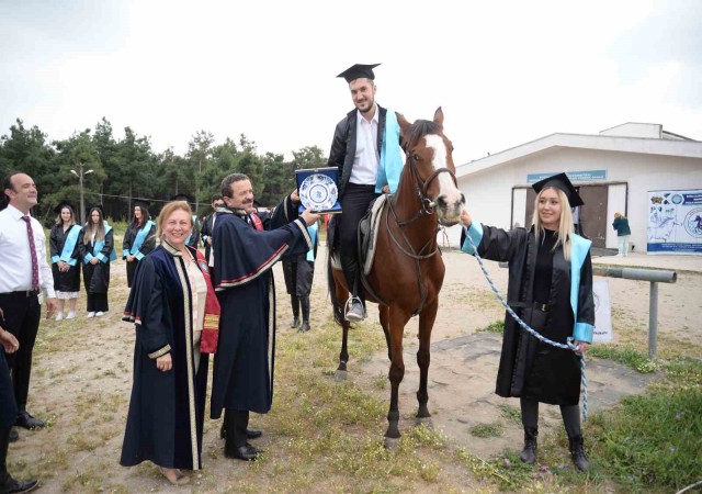 Bursa Uludağ Üniversitesi'nde 2022-2023 akademik yılını başarıyla tamamlayan fakülte, yüksekokul ve meslek yüksekokulu öğrencileri için mezuniyet töreni düzenlendi. Mennan Pasinli Atçılık Meslek Yüksekokulu öğrencileri, mezuniyet belgelerini at üstünde almalarıyla dikkat çekti.