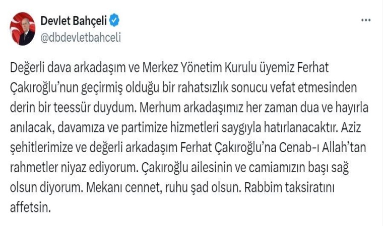 MHP lideri Bahçeli, X hesabından yaptığı paylaşımda, geçirmiş olduğu bir rahatsızlık sonucu vefat eden MHP Merkez Yönetim Kurulu üyesi Ferhat Çakıroğlu için taziye mesajı yayımladı. Bahçeli, mesajında şu ifadelere yer verdi: