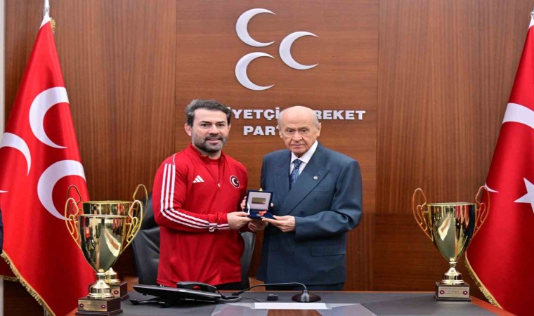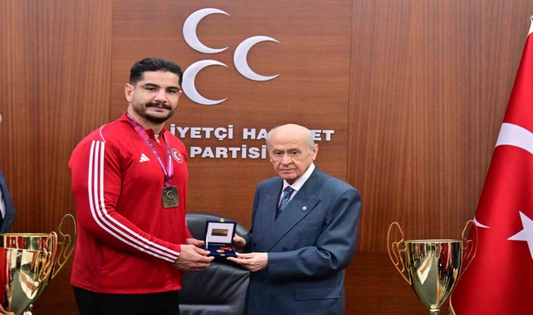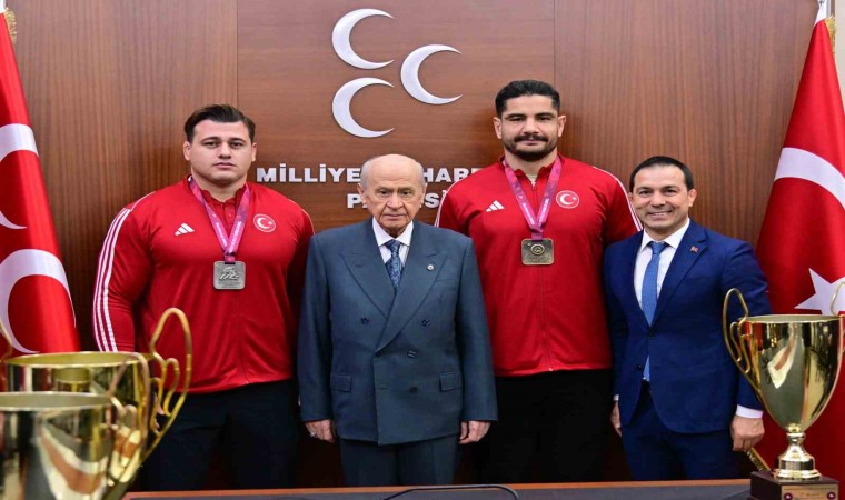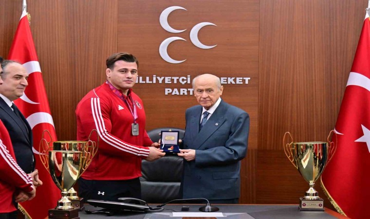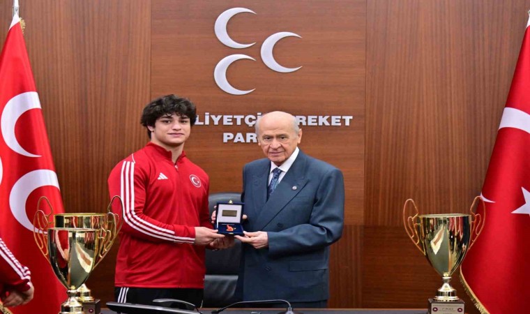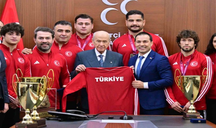 Milliyetçi Hareket Partisi (MHP) Genel Başkanı Devlet Bahçeli, Avrupa Güreş Şampiyonası’nda şampiyon olan sporcuları makamında kabul etti.